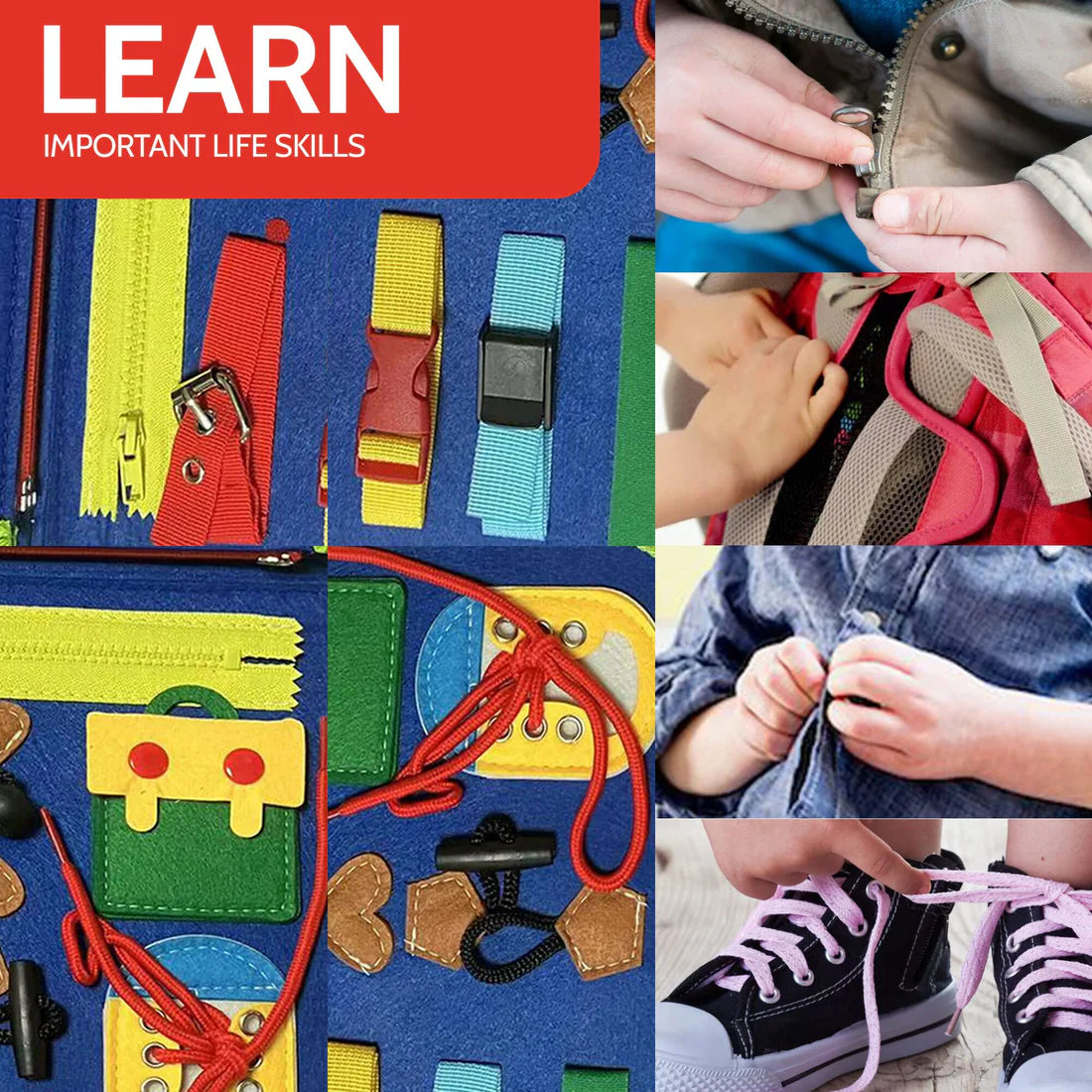- 【Busy Board Educational Toys】 Montessori educational busy board helps your kids develop fine motor skills. This Montessori toddler toy includes multiple skill activities including buckle, zipper, shoelace, belt, button, clock, calendar, shape matching, etc. Good for practical life skills and cognitive development.