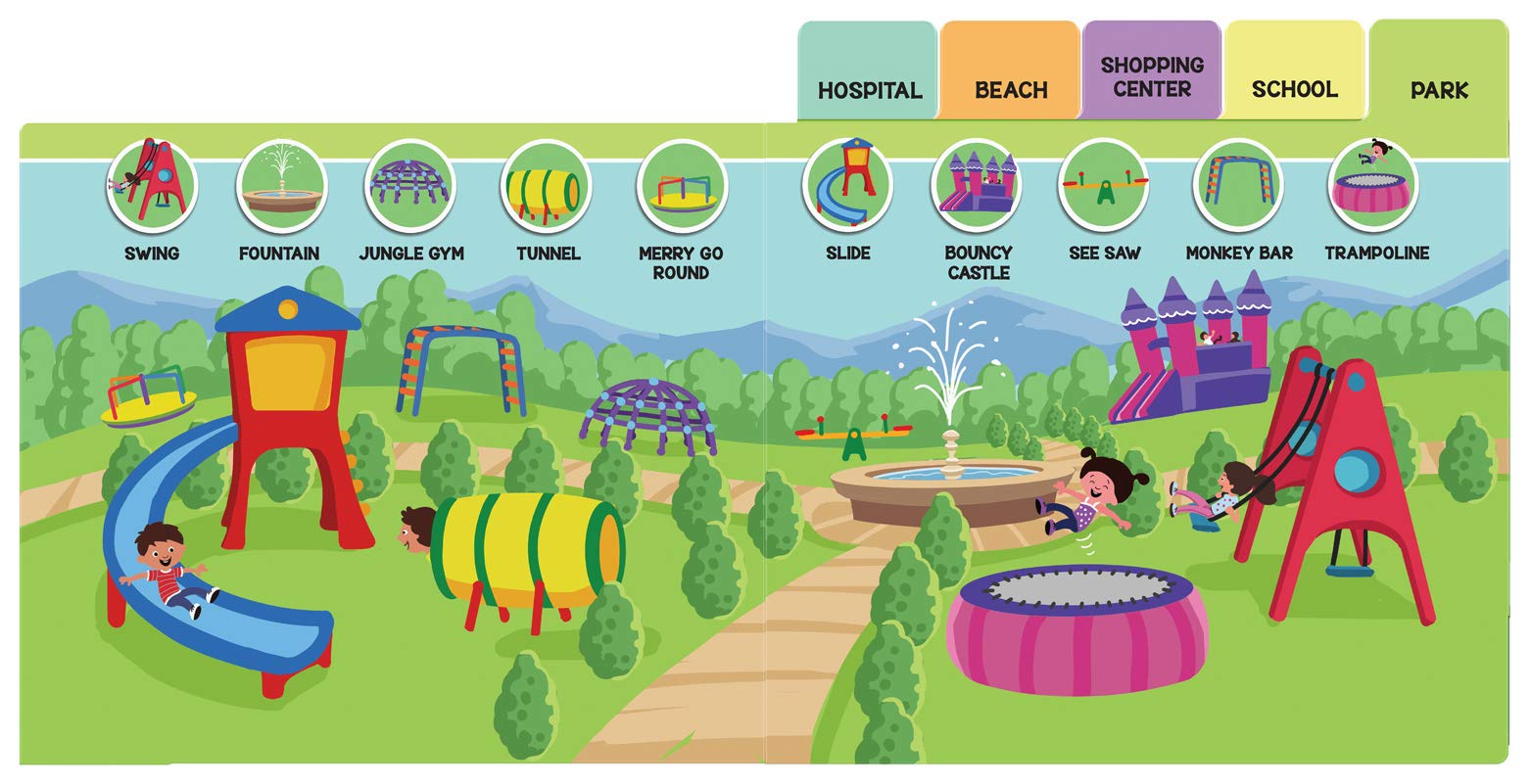 A wonderfully illustrated book for toddlers to seek and find different objects found at the park, hospital, beach, shopping center and school. Attractive images and large labels at the top of each page help the child seek the objects faster.